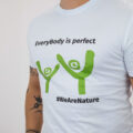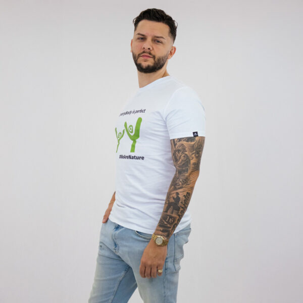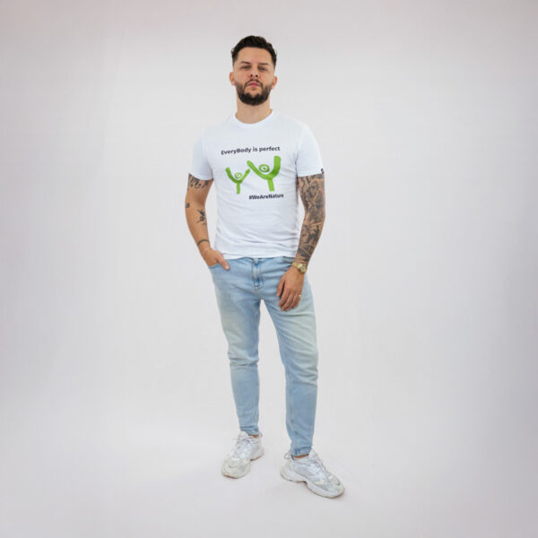 Бяла тениска с отличителна, минималистична графика на две зелени фигури и посланието „EveryBody is perfect.“ Създадена за мъже, които ценят увереността и автентичността, тази тениска съчетава стил с фино послание за себеприемане.