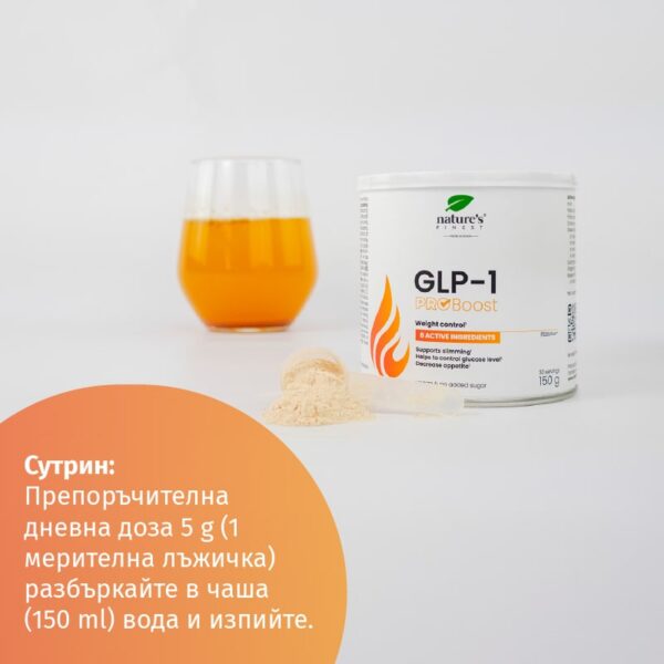 GLP-1 ProBoost: Препоръчителната дневна доза е 5 г (1 мерителна лъжица). Смесете в чаша (150 мл) вода и пийте. За точно дозиране препоръчваме теглене.
