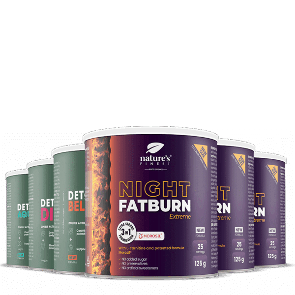• Night Fatburn Extreme: Формула, която подкрепя отслабването и помага за стабилизиране на телесното тегло⁶. Съдържа патентована формула Morosil®, извлек от червено вино, L-карнитин и извлек от валериана, който помага да се запази естествения сън и допринася за оптимална релаксация.
