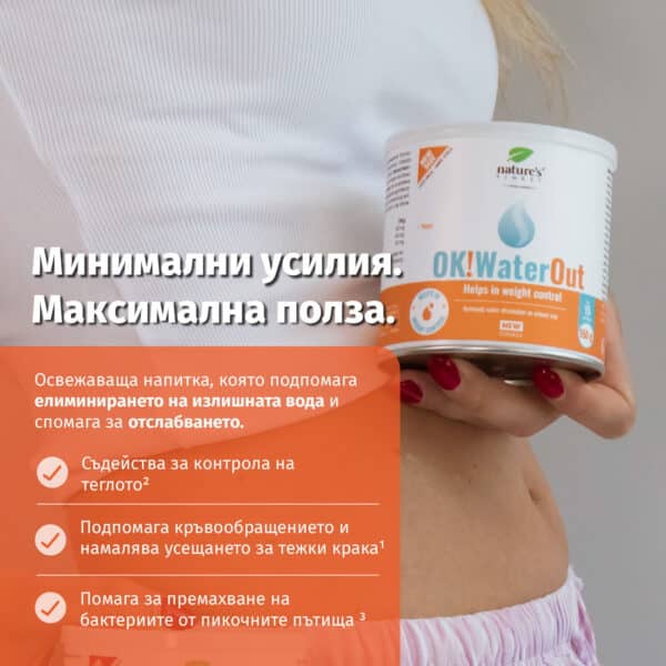 OK!WaterOut с естествените си съставки насърчава извеждането на вода чрез бъбреците³, като същевременно подкрепя жизнеността на тялото¹ и помага за поддържане на вашето телесно тегло²